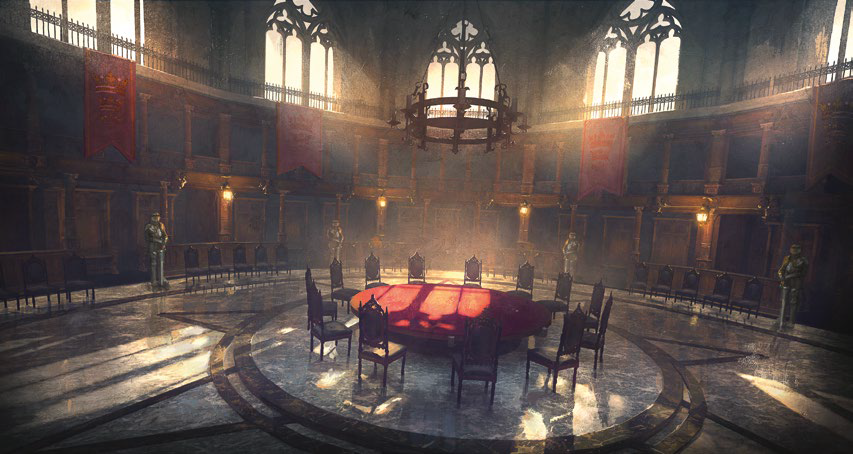 You enter the building, and quickly climb to the first floor. Here, you pass a corridor adorned with elegant dark wood and paintings depicting noble knights and heroic deeds, leading to a wide room. Tapestries adorning the walls display a crest with three crowns, the same that were on the late Sir Ian's cane. The morning sunlight filters through intricately carved windows, casting an ethereal glow across the room's centerpiece: a large, round table surrounded by numerous empty chairs.