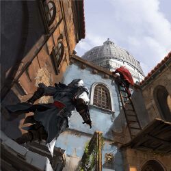 At dusk, they infiltrated the Palazzo splitting up into groups of two. One group to retrieve the safe combination and send it via carrier pigeon to the other, and a second group to find the vault room and await the combination. Eventually they discovered that the Doge was being blackmailed by the Templars who were holding one of his daughters hostage. He was being forced to fight against the Pope and the Assassins, a situation Alessandra and the others sought to rectify.[10] After identifying the blackmailer, the Assassins are led on a wild chase after he disguised two of his men as himself. Ultimately he was tracked down and assassinated, freeing the Doge and his daughter.[11]