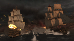 Since 1775, the Continental Congress had connection with other factions to help it in the war. The French playwright and spy Pierre Beaumarchais founded the shell corporation Roderigue Hortalez and Company to sell arms and gunpowder to the Patriots. In 1776, one of the ships' company, La Belladonna was attacked by the Royal Navy in the Caribbean Sea. Connor protected her with his own ship, the Aquila and discovered the Continental Captain Nicholas Biddle worked with the British Navy to make American coasts more dangerous and convinced the Congress to develop the Continental Navy with Biddle as his first Admiral.[1]