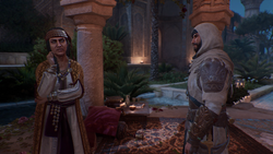 After searching Arib's correspondence at the Postal Bureau, Basim came across a letter using cryptonyms similarly to those employed by the Order, and decided to give it to Arib in the hopes she would lead him to the letter's author. Attending one of the poetess' public recitals, Basim spoke to Arib about the letter before they were both confronted by her patron and several guards. When Arib stood up to the patron and ended her partnership with him, the man ordered his guards to capture her and to eliminate Basim.[1]