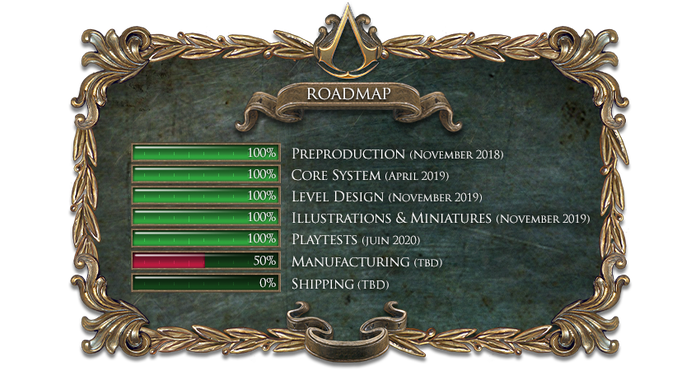In January 2020, after ongoing communication with the manufacturer's engineers some minor changes were made to the miniatures to ensure that they would cast properly. Some had to be into multi-part miniatures to keep their poses. Creed vs Crow received a content update that removed some cards with their tokens and added others.[48] In February, due to the COVID-19 pandemic, deliveries were delayed for at least 4 months. Box organization was designed, with each figures place in the plastic mold being worked out. The illustrations and miniatures were also all completed. The rule book had still not been fully approved by Ubisoft at that time.[49] In March, the rule book had been approved and proofread. Translation on the campaign book then started.[50] In April, all miniatures were validated and ready for casting with red wax models. The team then received White Boxes to check final component quality, dimensions and number of elements, and to organize how best to fit everything in the boxes. The Roma expansion was noted as being too big and its dimensions have since been rectified. The cards were then sent to be translated.[51] By September, playtests were finished and manufacturing was halfway completed.[52]