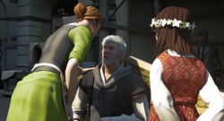 Some time after, Ezio finished writing in his study. Sofia then informed him that she and Flavia were leaving for Florence; Ezio decided to go with them. There, Ezio sat down on a nearby bench while the pair bought some groceries, and as Ezio watched, a young man sat down with him and berated the women of Florence.