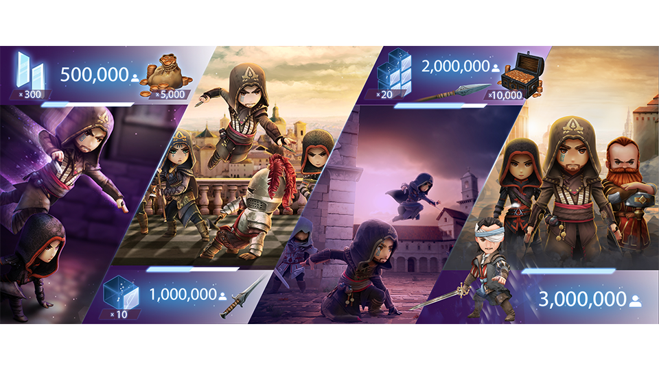 By 7 November, the necessary two million users had registered to unlock the third reward tier,[20] and by 16 November, all rewards had been unlocked.[21] For players who had already downloaded the game, thus bypassing the need to pre-register, the developers assured that they would only need play the game any time between the aforementioned dates in order to claim the rewards.[22] It was during this time that the Animus Premium Access subscription was revealed. For the monthly fee of $9 USD, or the equivalent in the regional currency, players could further their game progression by earning a 20% increase on Daily Login and Daily Objective rewards, 20% faster regeneration rate of Rift Tokens, and 20% faster timers in all headquarter rooms.[23] As part of a promotion celebrating the release of Assassin's Creed: Odyssey, Alexios and Kassandra were added to the Hero roster.[24] Between that, on 9 November, the next major version, Update 2.0.0 was released marking the official addition of the Animus Premium Access subscription as well as some revision Sync Bonus Heroes and various other fixes, optimizations and improvements. The only update notes for 2.0.1 (16 November) and 2.0.2 (4 December) were simply that the game was officially available worldwide and to stay tuned.[16]