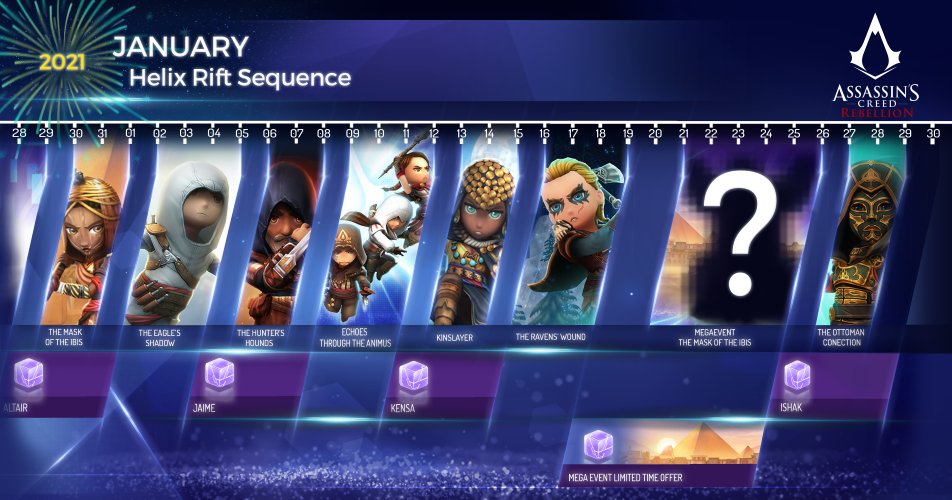In celebration of the New Year, Rebellion's Helix Rift schedule for January 2021 was released on 31 December 2020. Like December, it also featured a new hero in a mega-event at the month's end, this time in The Mask of the Ibis.[46] On 8 January, 2021, a bigger picture of the silhouetted hero for The Mask of the Ibis was posted to Twitter,[47] before it was revealed as Cleopatra on 11 January.[48] Her skills and weapon details were posted to the Ubisoft forums three days later.[49]