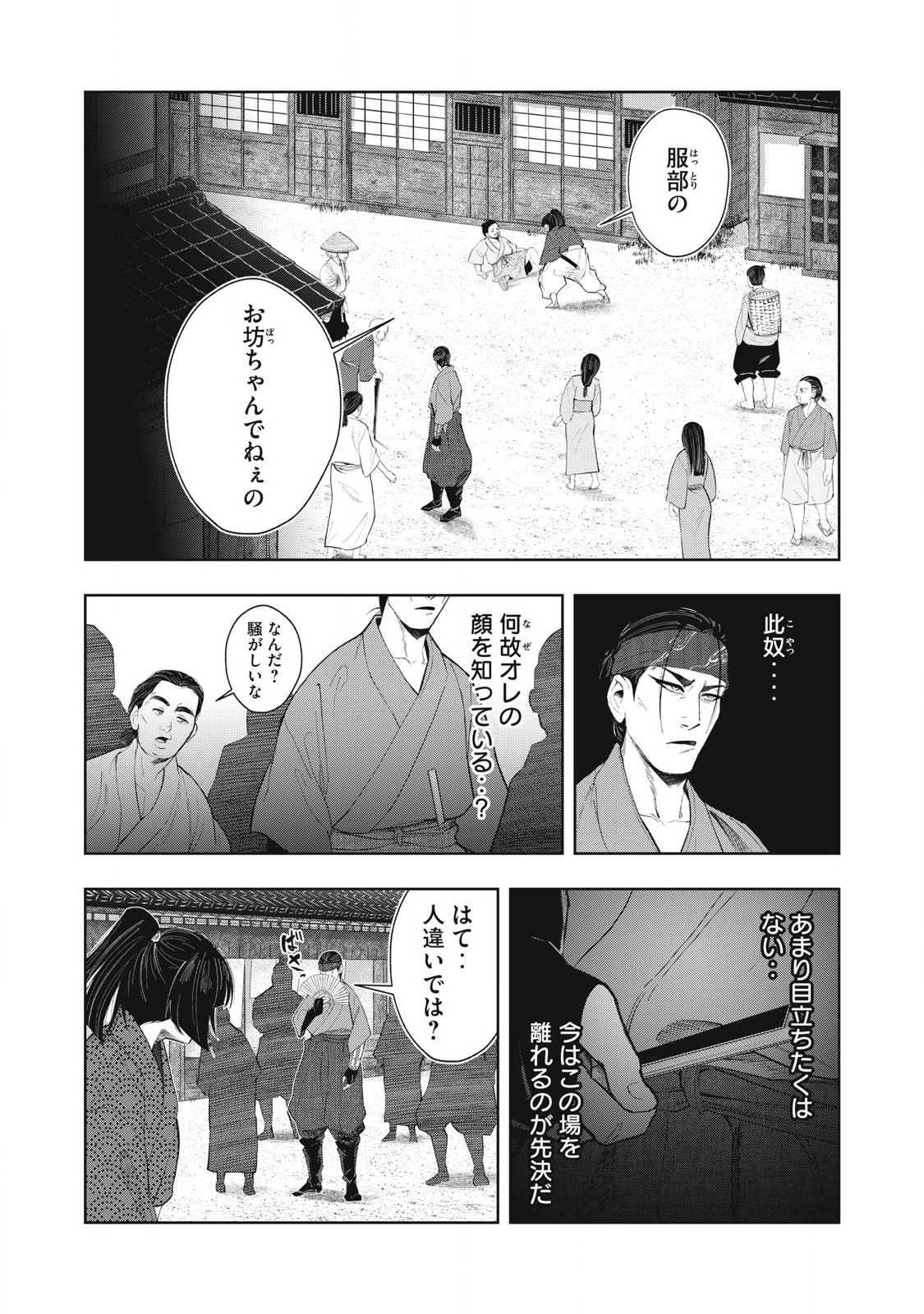 Sandayu points to Hachi-rou and reveals that he is actually one of the samurai who had attacked Masayasu's village. He explains that the villagers saved Hachi-rou because they did not want him going down the path of violence. He also remarks that Masayasu has a unique gift, as his eyes can captivate people; something Masayasu himself has been aware of ever since he served as the local samurai of his village.