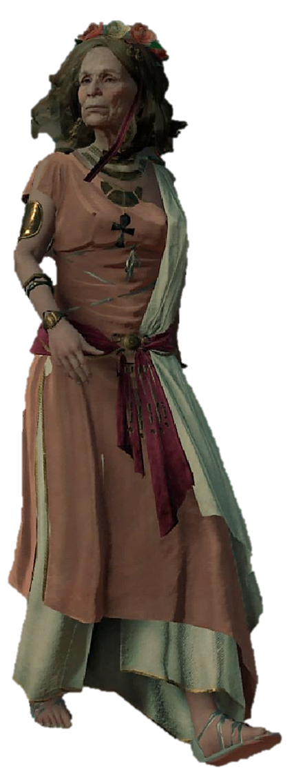 Around 48 BCE, Hotephres stole a magistrate's ledger revealing the identity of Berenike and her corrupt deeds. Apollodorus sent the Medjay Bayek of Siwa to recover the ledger from Hotephres but, unbeknownst to everyone, the latter's daughter Shadya had discovered the ledger and taken it with her. Having raided Hotephres' villa in Euhemeria, Berenike learned of this turn of events and had Khenut, Hotephres' wife, and Shadya kidnapped and brought to the lighthouse. Accompanied by gladiators from the Krokodilopolis Arena, Diovicos and Viridovix, Berenike ordered the gladiators to kill the child. When they refused, Berenike executed Shadya herself by tying her feet to large rocks and submerging her in the waters near the pier, drowning her.[1]