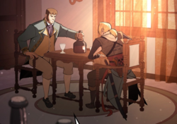 While Hendrik was ultimately killed by the Templars in his room at the company's dormitories in Macau, Young was protected by the British Assassin Edward Kenway, who was also on Angkor's trail.[4] Young subsequently teamed up with Kenway to find the lost city, defecting from the company and stealing one of their ships in the process.[5]