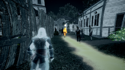 • While using Eagle Vision and roaming Monteriggioni as Desmond, a red trail was visible that led from the fountain with the Assassin insignia to the door of Mario Auditore's study. The trail was colored similarly to the blood glyphs of Subject 16, and appeared to be made up of many footprints. In an interview with Andrien Gbinigie, developers Darby McDevitt and Falko Poiker explained that the trail was intended to help gamers find their way back to the Sanctuary, though its red color was a design oversight.[73]