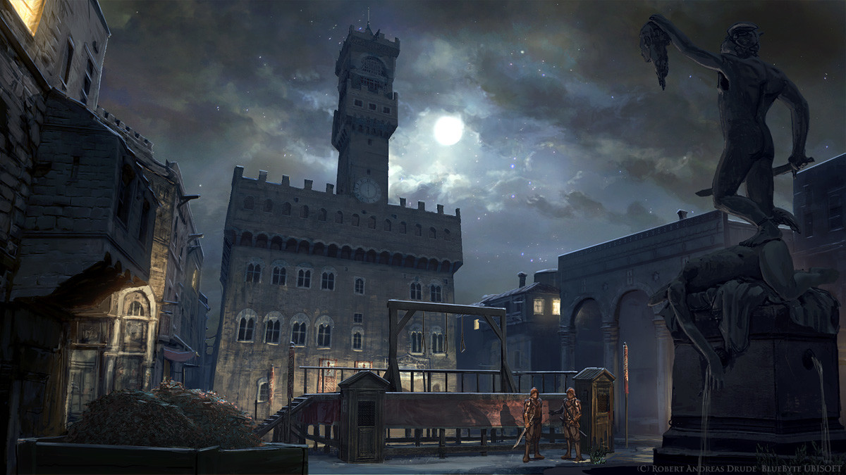 Concept art of the Palazzo della Signoria at night in Assassin's Creed: Identity |