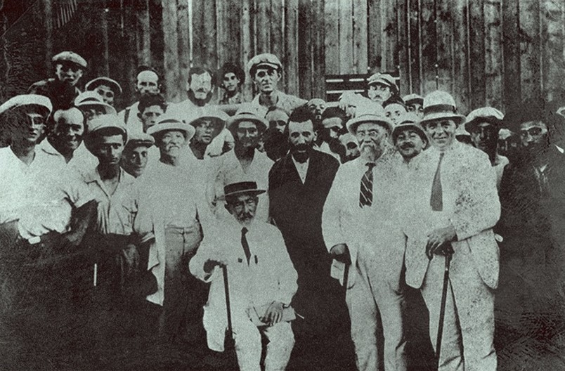 Ahad Ha'am sits next to Rabbi Yabloner, right, with other Naḥalat Yaakov ḥasidic colony surrounding them. |