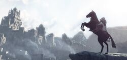 A variety of horses could be found throughout the Kingdom as well, either in corrals or stables, or standing alone on the path with their rider nearby. During the height of the Crusades, horse-drawn carriages and warhorses were also common sights on the battlefield.[5]