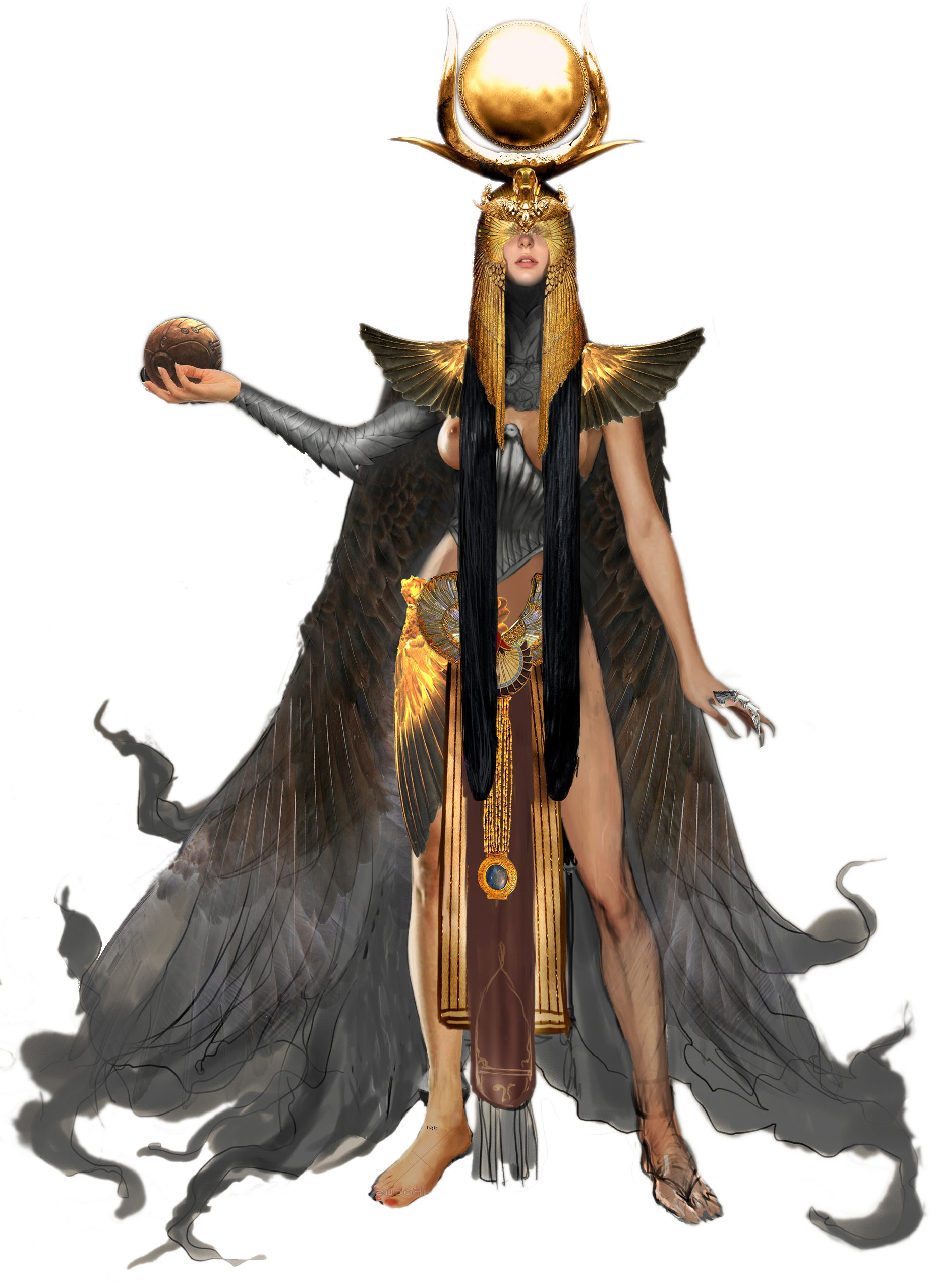 Jeff Simpson's concept art of Isis for Assassin's Creed: Origins ended up used as a base for an outfit worn by Cleopatra. The statue of Isis in Assassin's Creed: Origins is modeled after Greco-Roman statues, holding a cornucopia in her left hand and a rudder in her right hand.