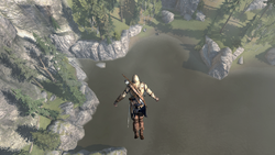In addition to the Leap of Faith, Arno could employ a similar maneuver known as the "Base Jump", leaping from a high point and swinging on an object as he fell to the ground.