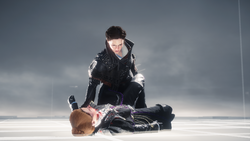 Hurling a smoke bomb at her opponent to disorient her, Lucy continued her onslaught, rapidly slashing at Evie, but was eventually disarmed. In a last desperate attempt, she charged at the Assassin, who countered by side-stepping the attack. As a result, Lucy crashed head-on through a stained-glass window, but managed to grab onto the Precursor necklace around Evie's neck, arresting her otherwise deadly plunge.[7]