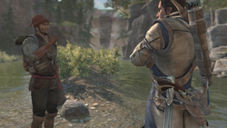 It was around that time that Norris confessed to Connor that he had romantic feelings for Myriam. With the aid of the Assassin, Norris attempted to make Myriam aware of his affections, though his initial attemps at gaining her attention with gifts failed, causing his confidence to falter.[4] However, after gathering the necessary ore[5] and having it crafted by David Walston, the Homestead's blacksmith,[6] he presented her with a new hunting knife, which saved her life when she was attacked by a poacher.[7]