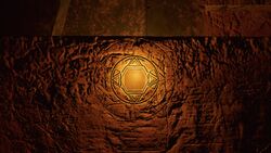 Around 34 BCE, the Medjay Bayek investigated rumors of ghosts and strange happenings in the Desheret Desert. While exploring the sands, he entered the buried Qeneb.too Kah'Aiye vault, where he saw a depiction of a Memory Seal engraved into one of the rock pillars holding up the vault's ceiling. After inserting the Seth-Anat stone in the engraving's empty center space, the stone conjured a host of illusory undead soldiers. Fleeing the temple, Bayek collapsed unconscious just outside its entry. When he awoke sometime later and returned to the temple, he found that the Memory Seal symbol had mysteriously disappeared.[9]
