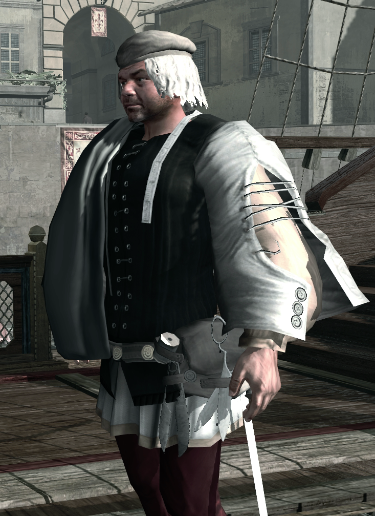 The merchant was stationed on a ship, and had many guards on the ship patrolling constantly, including two armored guards. At some point in 1497, the Assassin Ezio Auditore da Firenze set out to assassinate the merchant, in order to weaken Savonarola's rule. Making sure not to attract any attention, the Assassin made his way onto the stern deck. From there, he leapt down on the unsuspecting merchant and struck with his Hidden Blade. In his dying moments, the merchant was shocked by his actions, but also claimed that the people needed to be coerced sometimes.[1]