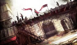 Significant improvements were also made to the town's infrastructure, and the Villa Auditore was gradually renovated.[12] By December 1499,[14] Monteriggioni had become a vital headquarters of the Assassins, whose flag flew over the town.[12] Around this time, Mario also added cannons to the town's defenses.[15]