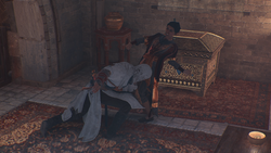 Shortly after, another merchant came bearing the hairpin she desired. Upon seeing the item, Ning ordered her guards to leave the room and allow her to speak in private with the merchant, who was secretly the Hidden One Basim Ibn Ishaq. As she admired the hairpin, Ning went over her life and the lessons she had learned, including the fact that one could only rely on oneself to achieve their goals. Having deduced Basim's identity, she then tried to attack him with the hairpin, but the Hidden One assassinated her, ending the Order's influence in Karkh.[2]