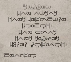 - ↑ Romanized as "zrhogwusôd wnhæôdkwat oænos oænos sízwrid; hazàæ huchàæ chàyzæs; mnrhngwardachs Lug". Translated from Isu language: "In war and in love there is only one goal; The search for a better future; Lug the Polymath".