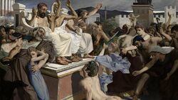 According to Herodotus, Athens sent Philippides to ask Sparta for aid at the battle of Marathon and in the way he met with the god Pan. Pan promised to help the Athenians, by sowing panic and terror in the ranks of their enemies.[2][3] After the battle was won, he ran all the way from Marathon to inform the king and fell down dead after it.[1]