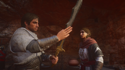 - —Basim and Rebekah discussing the former's new scimitar, 862.[src]-[m]