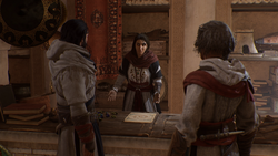Following her arrival in Baghdad, Rebekah helped Fuladh to set up a bureau in Karkh before becoming its Rafiq to investigate the Order's activites in the district.[5] She was later joined by Basim and Roshan, whom she informed of the corruption in Karkh, which had become stronger than usual, as there were rumors of harassment from officials and goods being seized.[1]