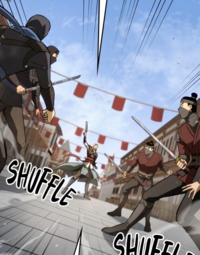 In time, the conflict between the two ninja factions escalated into a civil war, with fights between members of the two groups becoming commonplace on the streets of Macau.[6] As Saito and her men were under Sun's protection, Fuma Sukuna realized that he needed a powerful ally in the city as well and sent one of his men to secure an alliance with Madam Lee.[7] Despite the ninja's previous attacks against her company, Lee agreed to the partnership, secretly hoping to have her enemies destroy each other and thus allowing her to accumulate more power.[8]