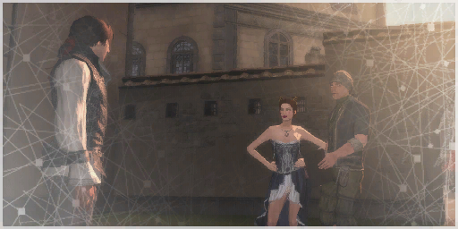 Ezio reached an enclosed yard, where he met a thief and a courtesan.
