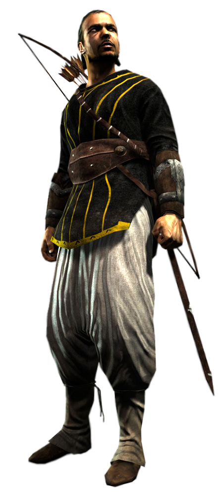 Talal usually carried a bow on his back, along with a quiver full of arrows. He also wore a sword sheathed in its scabbard, though he was more experienced with a bow and arrow. He wore a dark gray tunic with yellow stripes and plain white leggings. Talal also wore two vambraces on each wrist and had a large belt around him. He also had a goatee and had his hair braided flat against the back of his head. He was of average height and stature.[1]