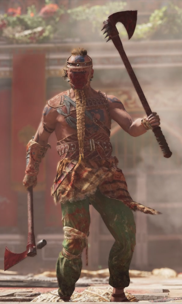 Hailing from the Germanic forests of Central Europe, he utilized twin battleaxes as his weapon of choice. In 47 BCE, he was challenged by the Medjay Bayek of Siwa, who witnessed him ripping off the ear of another fighter with his teeth. Bayek eventually defeated him with a sword and a shield.[1]