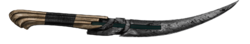 The Samsaama (Arabic: الصمصامة, "killing on the spot")[1] was an Isu dagger. In the 860s, the Alamut Hidden One Basim Ibn Ishaq recovered it, the sword Shamshir-e Zomorrodnegar, and the armor set Milad's Outfit from the chamber underneath the Northern Oasis, trading Mysterious Shards he had taken from Tha'abeen members.[2]