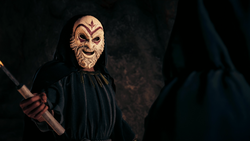 Although the cultists have separate mask styles for their male and female members, they accept Kassandra wearing Elpenor's attire without question, despite an obvious woman's voice coming from behind it.