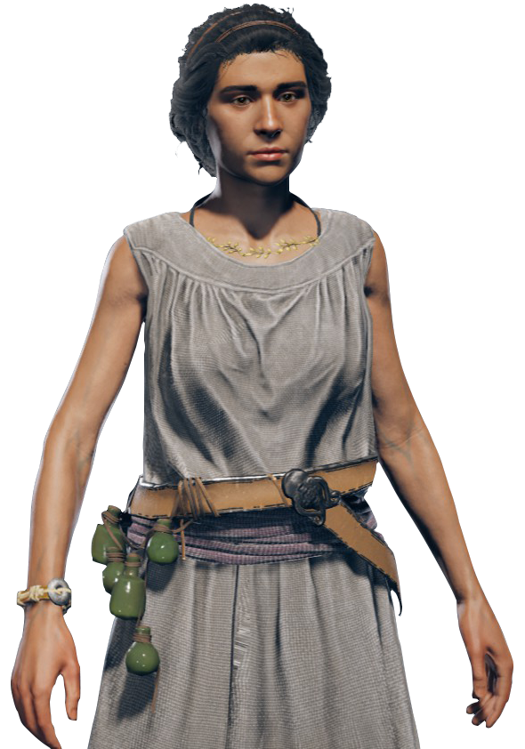 When Kassandra arrived at Potidaia, Timosa noticed her and left the village, telling the Magistrate of Potidaia that she was going to get some herbs to fight the plague. Instead, she contacted her Order, requesting backup, as well as to meet with the pirates who brought her more of the poison. However, the Magistrate was suspicious of Timosa, and sent his men after her. One of the men hit her, and Timosa pretended to lose consciousness.[4]