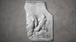 Fragment of a marble relief from a funerary monument with battle scene showing soldiers falling, escaping, or lying dead / 390 BCE (Classical Greece)