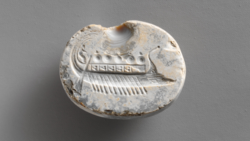 Chalcedony scaraboid gem engraved of a ship with steersmen, oarsmen and warriors / 525-500 BCE (Archaic Greece)